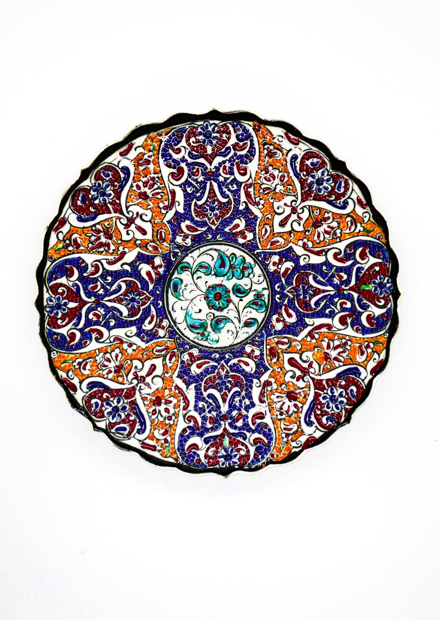 Realizat din ceramică de calitate și decorat cu modele originale pictate manual, acest platou este perfect pentru a prezenta aperitive, deserturi, brânzeturi sau fructe. Culoarea vibrantă și designul delicat vor încânta privirea și vor completa perfect orice aranjament culinar.